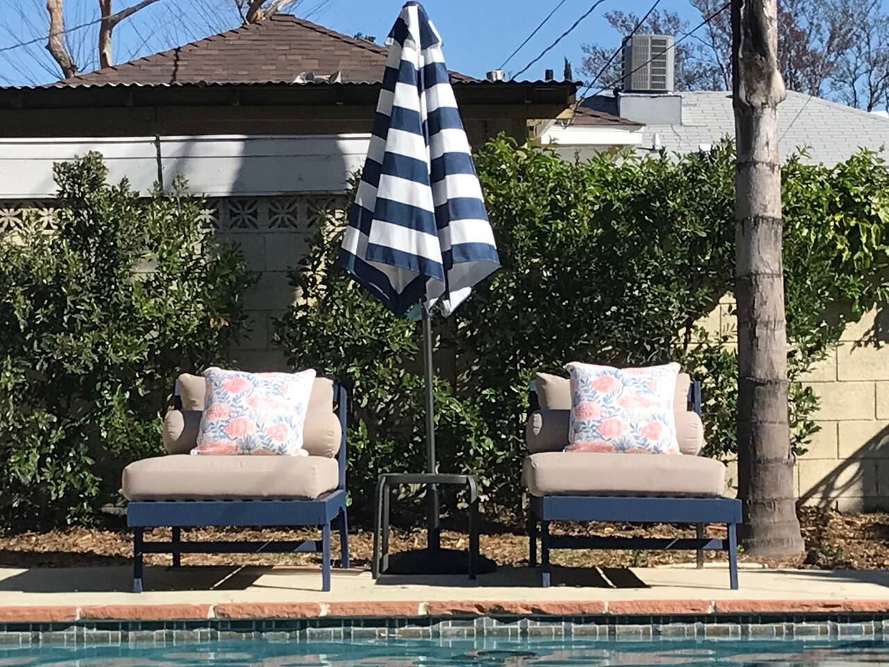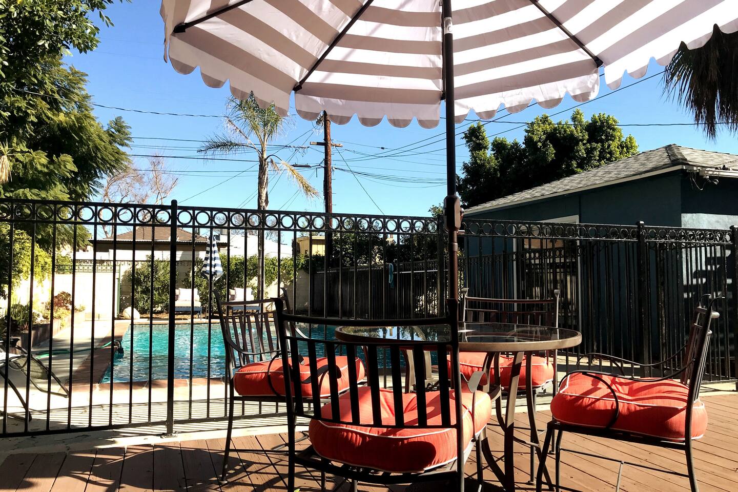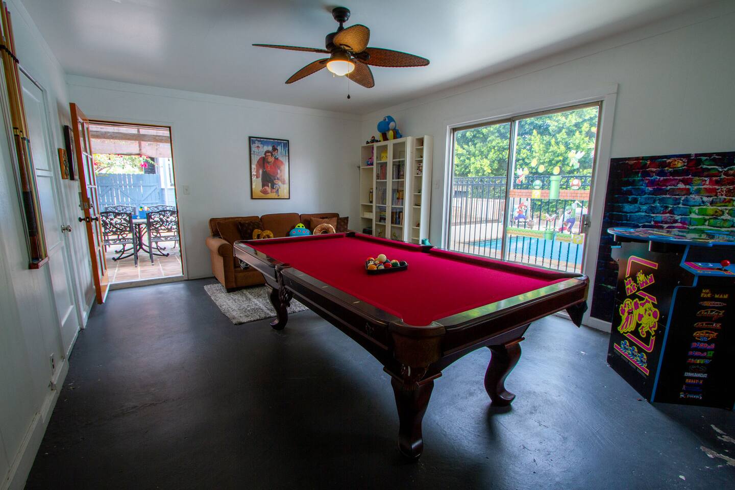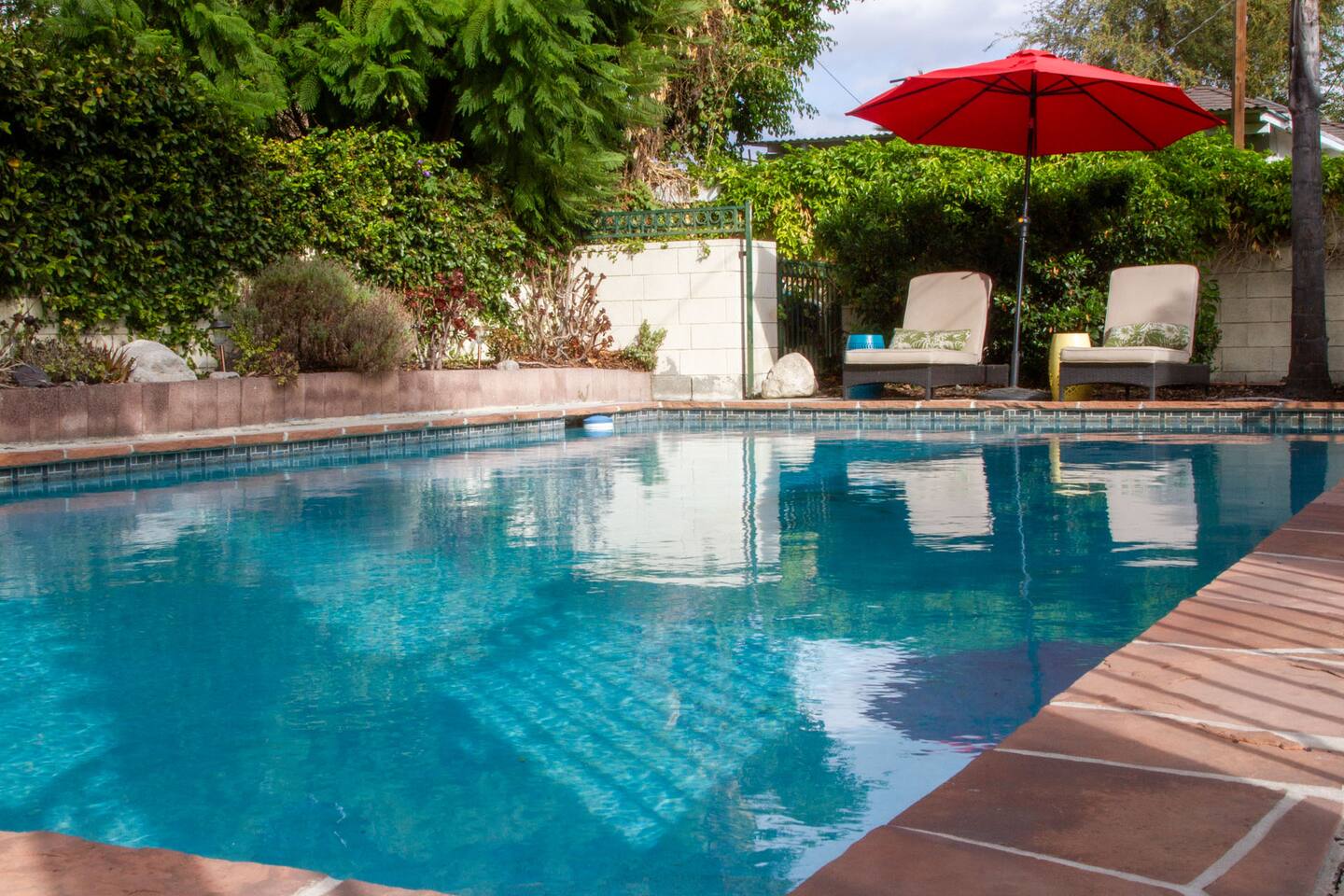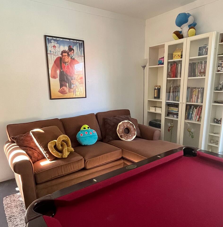 Relax. Connect. Have fun. This getaway features a separate game room with a full-sized pool table and games, a deck with an outdoor grill, and a private backyard with bean bag toss (located in the game room). This California Bungalow has 1,600 square feet of living space (1,200 square foot main house + 400 square foot game room), and is naturally bright with real hardwood floors, sunroom, updated kitchen, and bathrooms with vintage aqua and black tiles. Bedroom 1: King bed with private entrance to the deck and pool Bedroom 2: Queen bed Bedroom 3: Two twin beds Experience ultimate, snuggle comfort as all of the bedrooms have been recently upgraded with brand-new, top-of-the-line mattresses and microfiber bedding!! Fully equipped kitchen with breakfast bar Dishwasher, Oven, Microwave, and Stove Dining with seating for 5 (folding chair in the closet for 6) Outdoor dining area with seating for 8 Deck with outdoor gas grill or charcoal grill Private workspaces in the bedroom and in the game room. Outdoor seating lounge with beanbag toss. Large swimming pool with lounge chairs on sun deck Game room with pool table, vintage table-top Ms. Packman, Galaga, Dig Dug & more arcade games, 55-inch TV, sofa, and library Games, Books, Puzzles, Yo-Yo’s! Comfy reclining chair in the sunroom. Quiet reading/private time. High-Speed Wi-Fi & TV Central AC & Heating Washer/Dryer