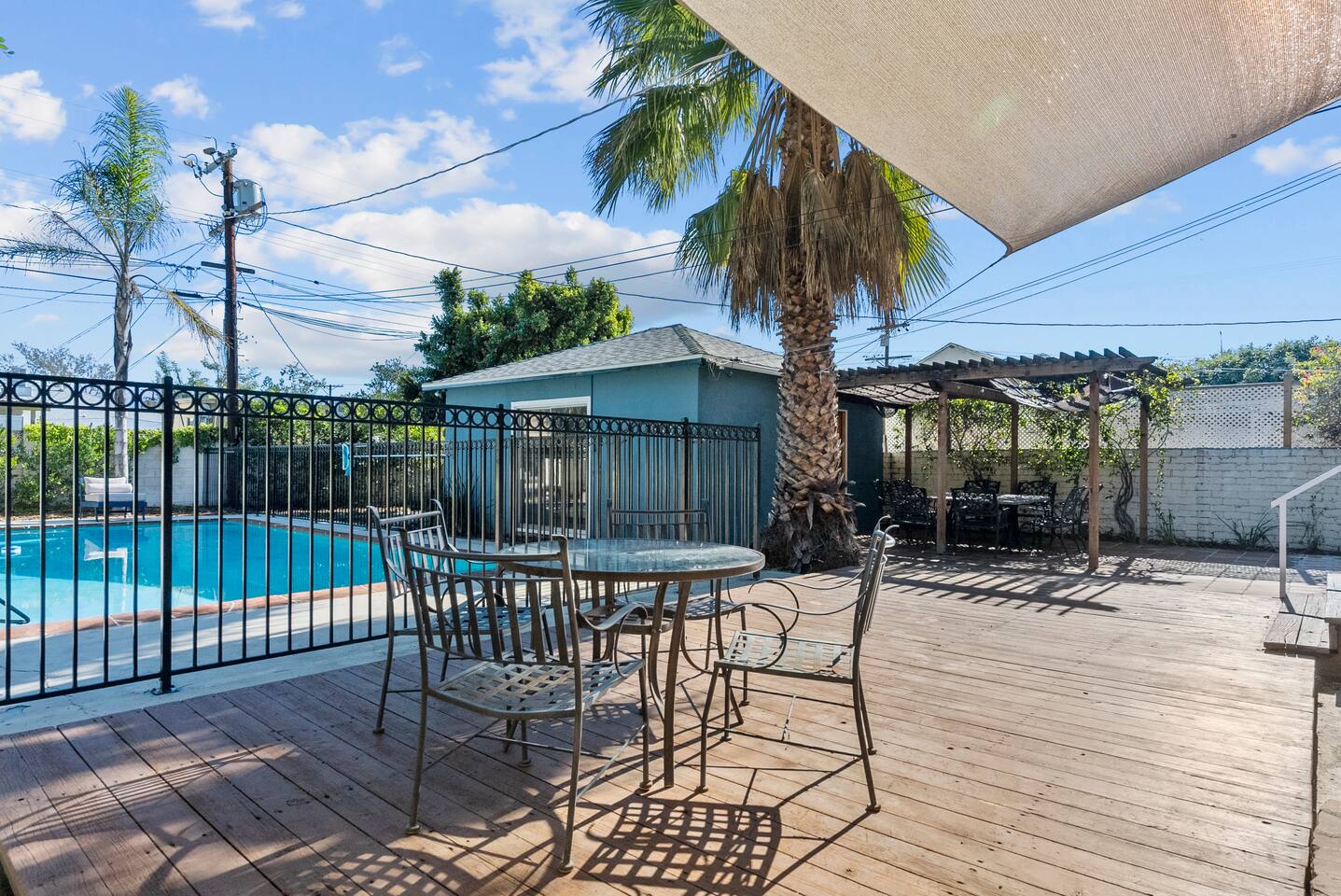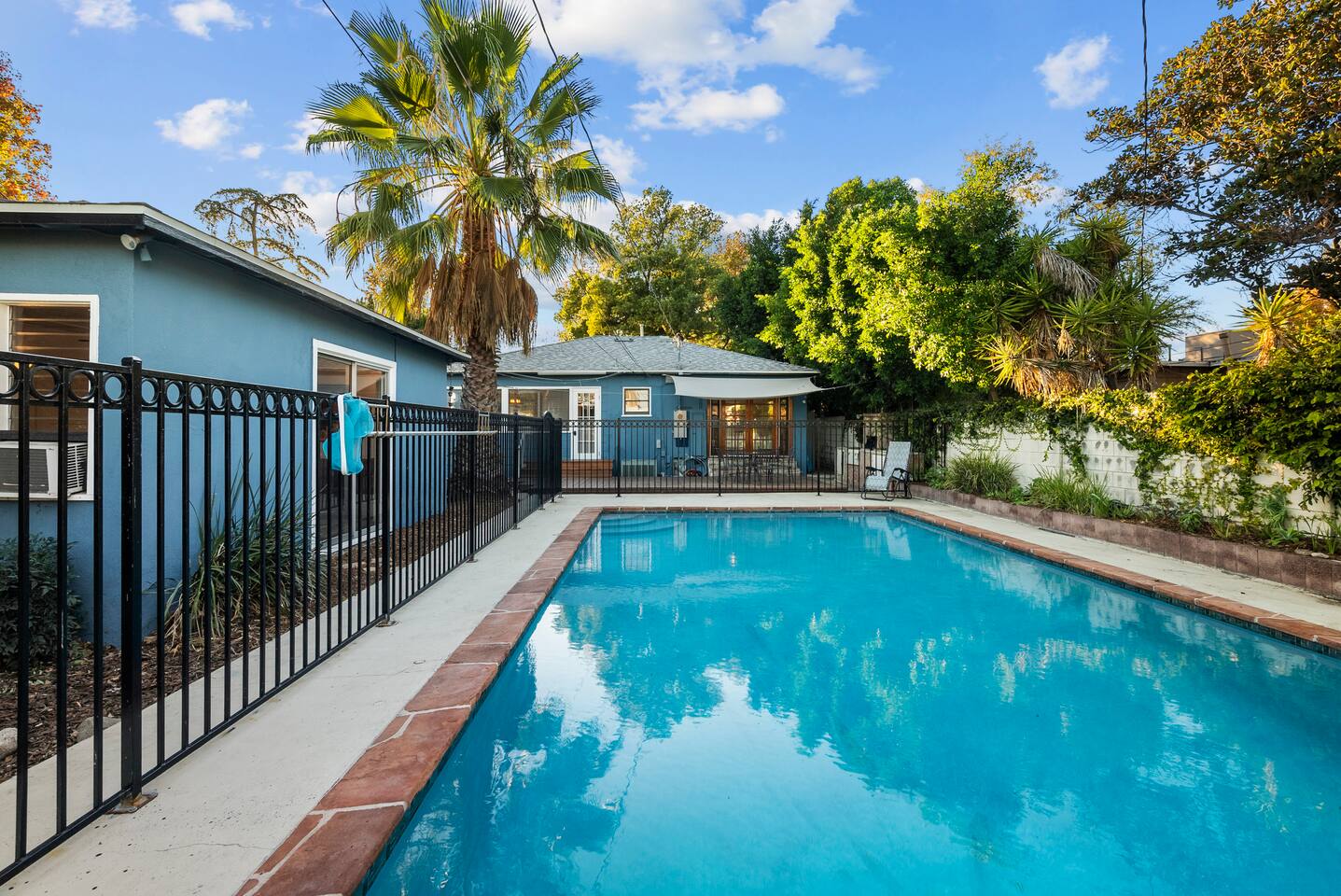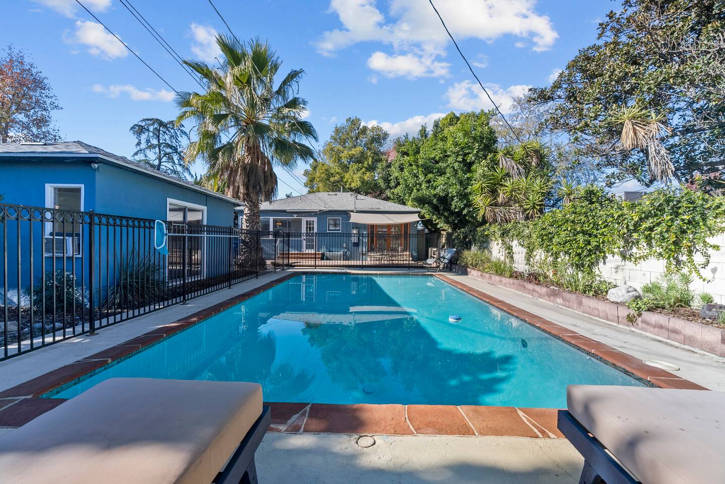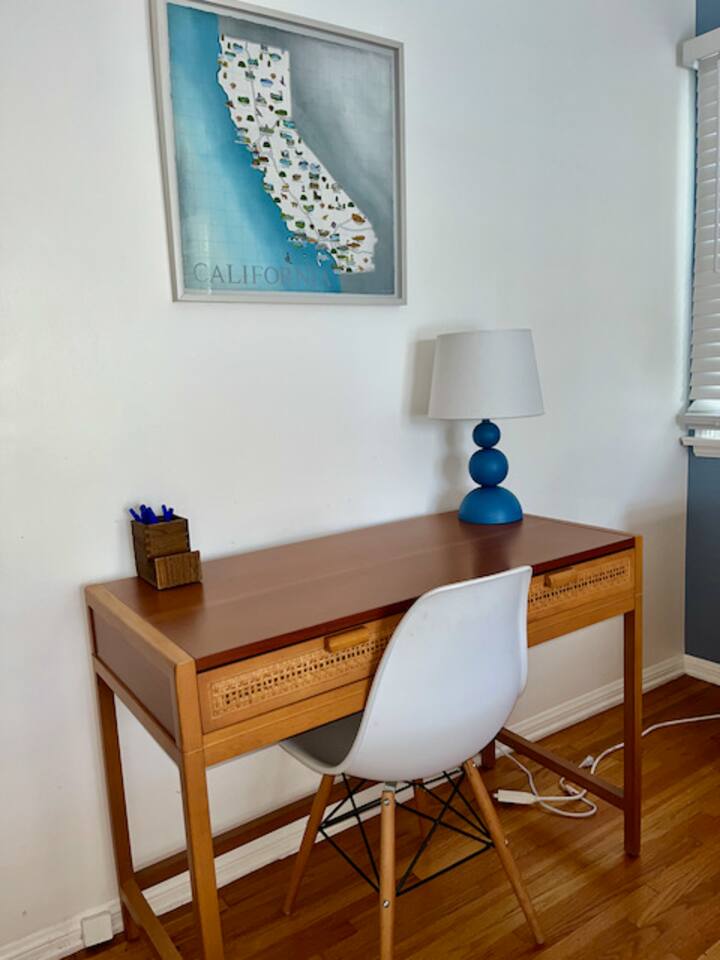 Relax. Connect. Have fun. This getaway features a separate game room with a full-sized pool table and games, a deck with an outdoor grill, and a private backyard with bean bag toss (located in the game room). This California Bungalow has 1,600 square feet of living space (1,200 square foot main house + 400 square foot game room), and is naturally bright with real hardwood floors, sunroom, updated kitchen, and bathrooms with vintage aqua and black tiles. Bedroom 1: King bed with private entrance to the deck and pool Bedroom 2: Queen bed Bedroom 3: Two twin beds Experience ultimate, snuggle comfort as all of the bedrooms have been recently upgraded with brand-new, top-of-the-line mattresses and microfiber bedding!! Fully equipped kitchen with breakfast bar Dishwasher, Oven, Microwave, and Stove Dining with seating for 5 (folding chair in the closet for 6) Outdoor dining area with seating for 8 Deck with outdoor gas grill or charcoal grill Private workspaces in the bedroom and in the game room. Outdoor seating lounge with beanbag toss. Large swimming pool with lounge chairs on sun deck Game room with pool table, vintage table-top Ms. Packman, Galaga, Dig Dug & more arcade games, 55-inch TV, sofa, and library Games, Books, Puzzles, Yo-Yo’s! Comfy reclining chair in the sunroom. Quiet reading/private time. High-Speed Wi-Fi & TV Central AC & Heating Washer/Dryer