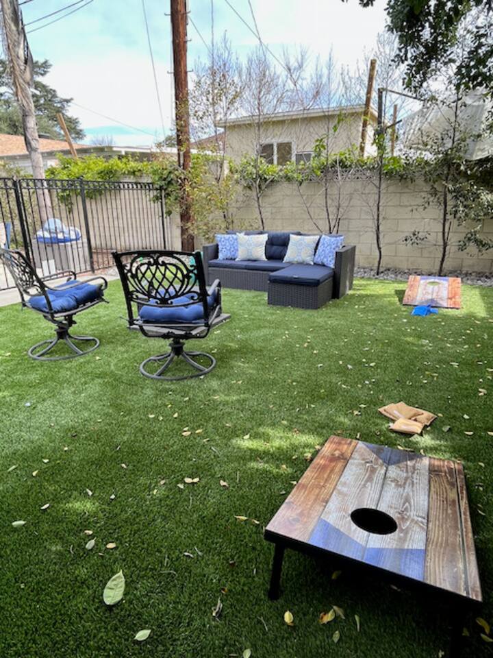 Open to long-term rentals! Great place to get SUN in the wintertime! North Hollywood has sunnier, warmer days and is still close to beaches, mountains, and LA attractions. Just 5 miles to Universal Studios, walking distance to NoHo West shops, and 4 miles from Burbank Airport. Ideal for a stay-cation or as a rejuvenation base for SoCal family adventures. This classic 3-bedroom home features a pool table, arcade games, King Bed, grill, and backyard lounge